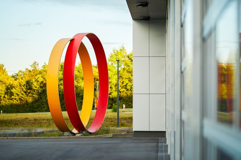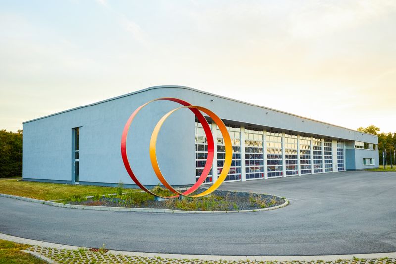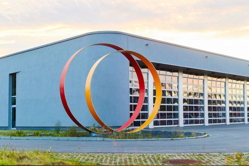 Zwei Stahlringe symbolisieren die Verbindung der beiden Gemeinden vor der gemeinsamen Feuerwache.