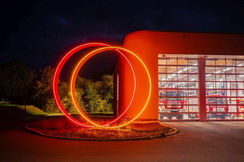 Mit der Skulptur „Feuerringe“ gewinnt die räumliche Situation an der Verbindungsstraße der beiden Ortsgemeinden und vor der Feuerwache, eine deutliche Markierung und einen weit sichtbaren, leuchtenden Blickfang.