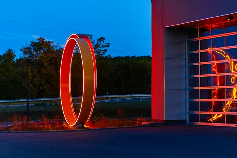 Die Farbigkeit mit Rot und Gelb steht für das Element Feuer. Darüber hinaus nehmen Kreise die Farben der Feuerwehrschläuche auf. Das ganze Jahr hindurch, auch in dunklen Jahreszeiten, zeichnen umlaufende, farbig leuchtende LED Bänder die Kreise in Form und Farbe nach.