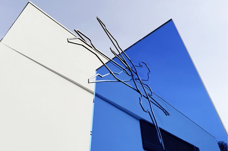 Die konturierte Darstellung der Figuren aus polierten Edelstahlprofilen betont den sportlichen Aspekt des Hunsrückbades. Die klaren Linien und kraftvollen Posen der Figuren stehen für die Präzision und Technik des Schwimmens.