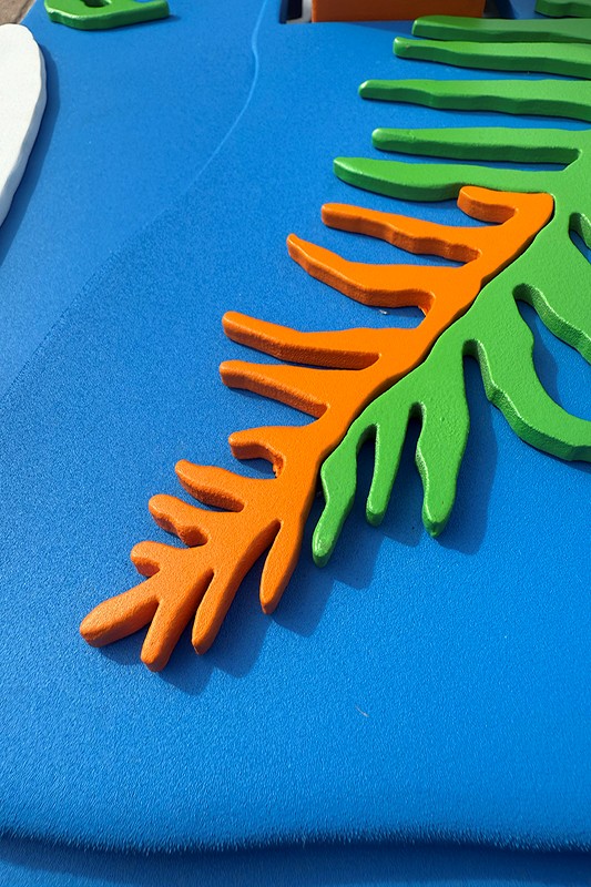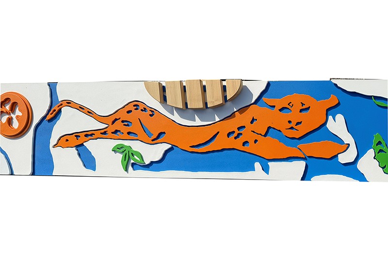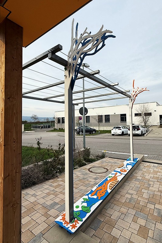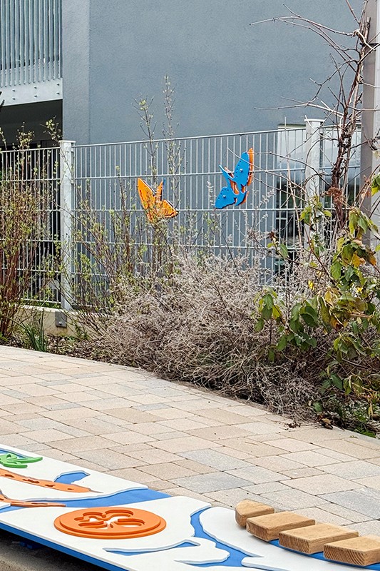 Das Kunstwerk wirkt so leicht wie ein Scherenschnitt, es ist jedoch aus lasergeschnittenem und thermolackiertem Stahl gefertigt. Auf einem kleinen Spiegel kann man sich selbst sehen und in die Welt der kleinen Wildlinge eintauchen. Die leicht sandige Struktur der Farbe ist sehr angenehm anzufassen und lädt die Kinder ein, das Kunstwerk frei nach ihrer Fantasie zu bespielen.