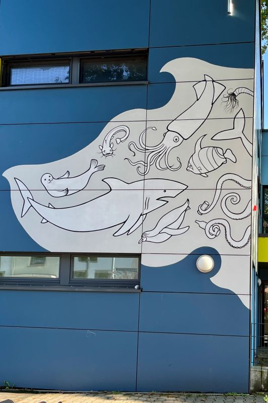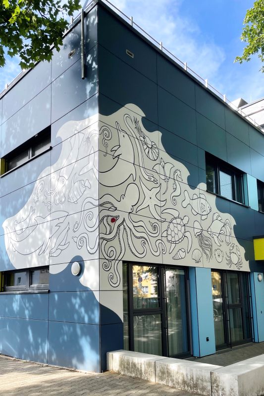 Die Konzeptidee des im Juli 2022 fertiggestellten Kunst-am-Bau Projekts an der Fassade der Kindertagesstätte Friedrich-Ebert-Straße in Weisenau basierte auf dem Thema Unterwasserwelt, das von der KiTa-Leitung grob vorgegeben war.