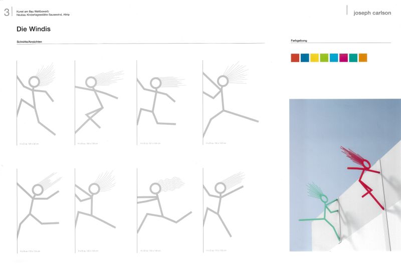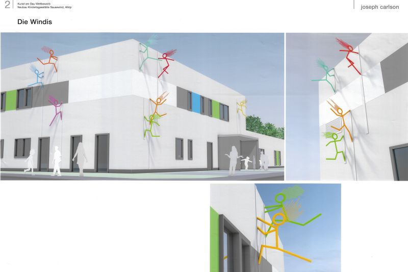 Das Kunstkonzept greift diesen Aspekt auf. Die Freude an Bewegung und körperlicher Aktivität als Grundbedürfnis eines jeden Kindes bilden den gedanklichen Hintergrund für das Kunstkonzept mit dem Titel „Die Windis“. Die Idee sind minimalistische Figuren in einer kindgerechten Formensprache, die die Kita lebendig werden lässt. Mit wehenden Haaren agieren sie auf der Fassade der Kita – dynamisch, ausdrucksstark und voller Energie. So erleben die Kinder die Faszination der Bewegung auf einzigartige Weise.